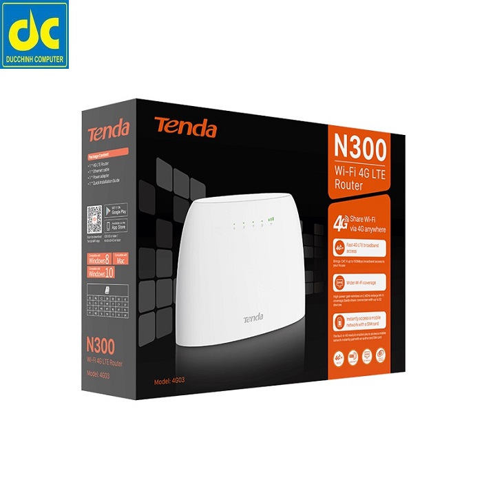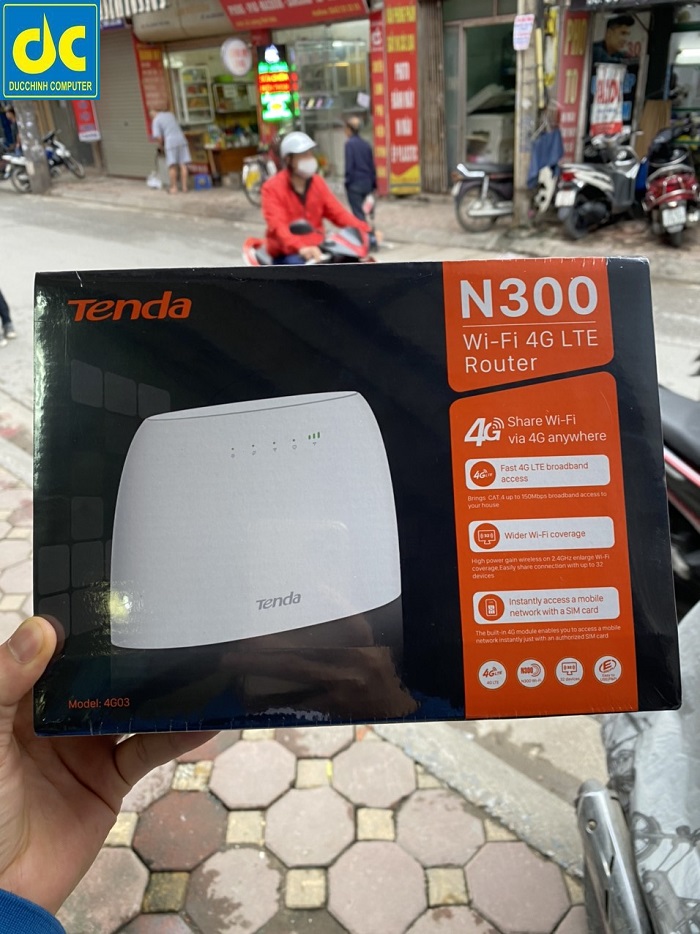 Tenda 4G03 là Router WiFi sử dụng Sim 4G LTE với công nghệ LTE mới nhất Chỉ cần cắm Sim và sử dụng ngay internet tốc độ cao, không cần cấu hình Phần cứng mạnh mẽ đáp ứng khả năng kết nối đến 32 thiết bị Cổng WAN giúp kết nối mạng Internet có dây, tự động chuyển sang kết nối 4G khi có sự cố Sử dụng WiFi Internet từ 4G ở bất cứ đâu 4G03 Router WiFi dùng Sim 4G LTE N300 Internet tốc độ cao ở bất cứ đâu Với khả năng thu sóng di động 4G LTE , Tenda 4G03 có thể cung cấp Internet cho bạn ở bất cứ nơi đâu mà không cần triển khai cáp quang. Thích hợp cho những khu vực như ngoại ô, nông thôn, trang trại, gia đình đi du lịch 4G băng thông rộng cho trải nghiệm Internet mượt mà Tenda 4G03 cung cấp tốc độ tối đa của LTE CAT4 đến 150Mbps , bạn có thể tận hưởng phim HD mượt mà, download file dung lượng lớn và video call ở bất cứ đâu Kết nối WiFi đến 32 thiết bị Trang bị chip xử lý tốc độ 880MHz trên tiến trình 28nm , Tenda 4G03 có thể chia sẻ WiFi cho 32 thiết bị kết nối Chuyển đổi dự phòng kết nối giữa mạng dây và 4G Trang bị cổng WAN giúp Tenda 4G03 có thể dùng kết nối Internet bằng dây. Nếu Internet qua dây mạng gặp sự cố, Tenda 4G03 sẽ tự động chuyển qua kết nối bằng 4G, đảm bảo cho việc sử dụng Internet không bị gián đoạn Không cần cấu hình Chỉ đơn giản cắm mini SIM vào Tenda 4G03, và bạn đã sẵn sàng để sử dụng Internet tốc độ cao, không cần cấu hình